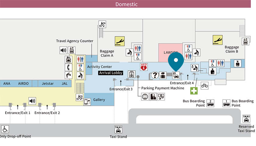 The car rental reception counter is located next to the general information desk Domestic Arrivals Lobby on the first floor.