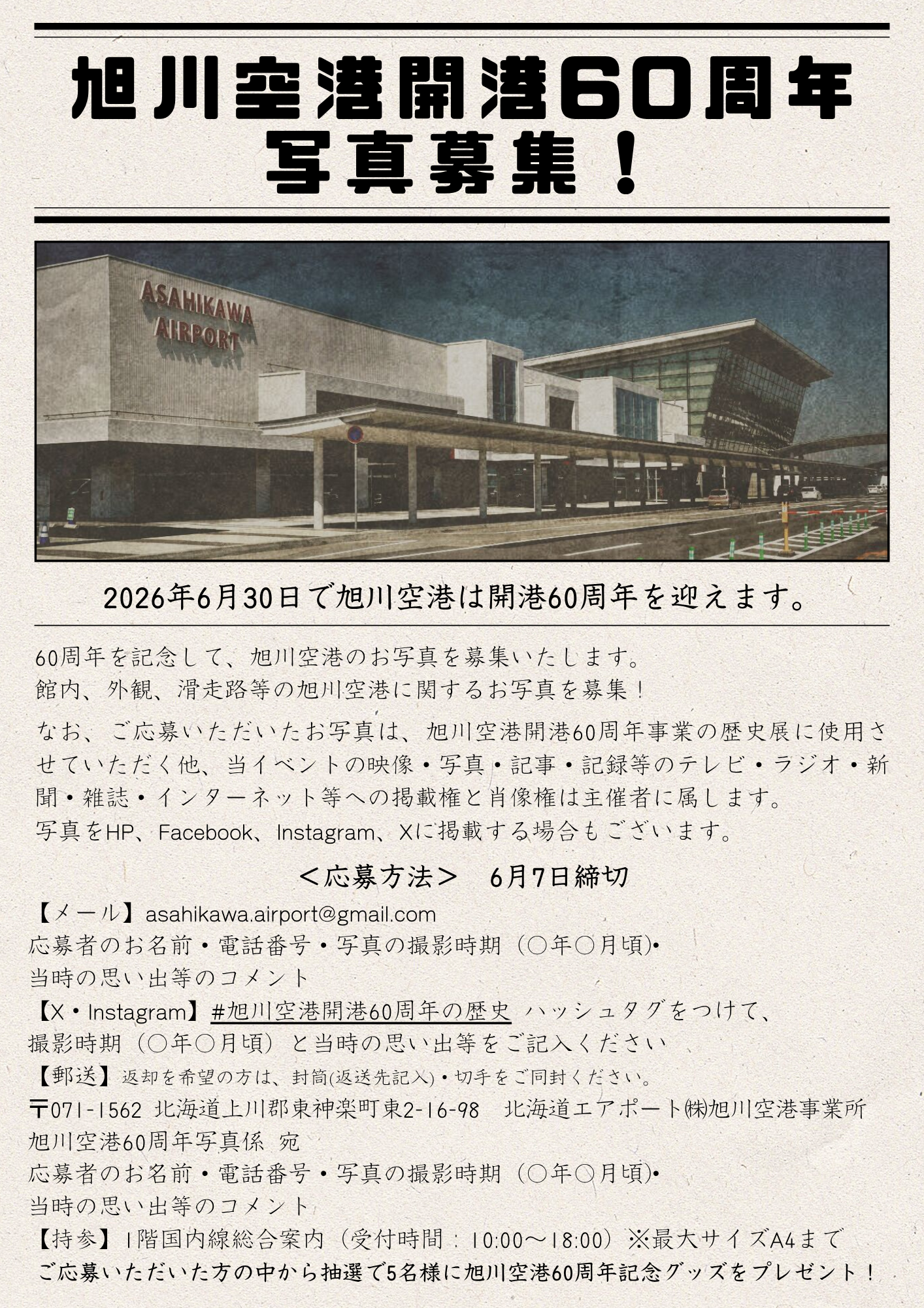 〒071-1562 北海道上川郡東神楽町東2-16-98 北海道エアポート㈱旭川空港事業所 旭川空港60周年写真係 宛