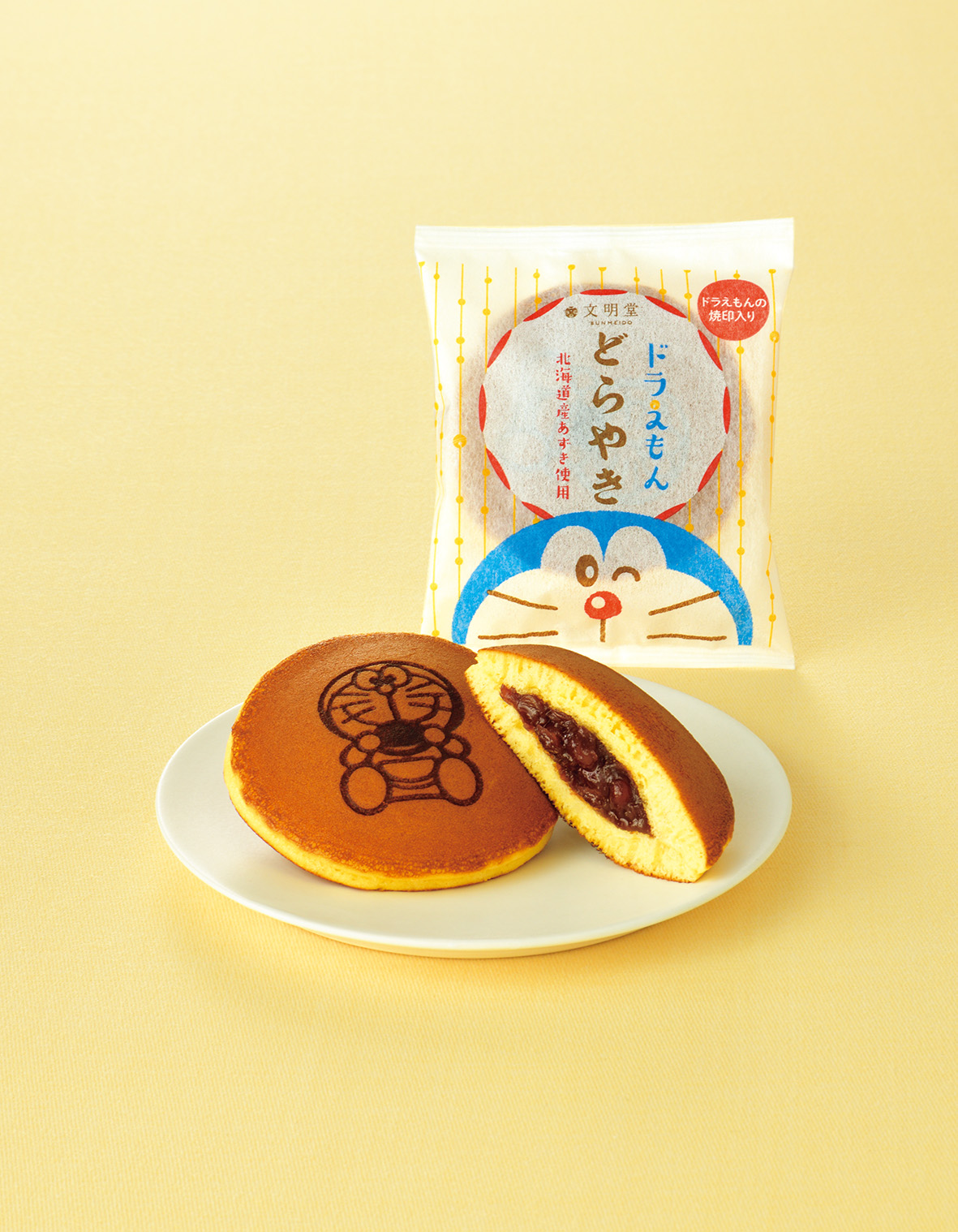ふんわり生地で北海道産小豆の粒あんを包んだどら焼きに、ドラえもんの焼印を押しました。おやつにちょうどいい、個包装の小ぶりなサイズです。