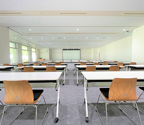 隣接するセミナールームの全面もしくは半面と連結させてご利用いただくことも可能です。連結時のレイアウトは「セミナールーム(大会議室)」をご覧ください。