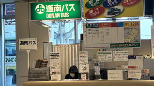 각 방면의 버스 시간표와 버스 승차장의 안내가 있습니다. 궁금한 사항은 카운터의 관계자에게 문의하십시오.