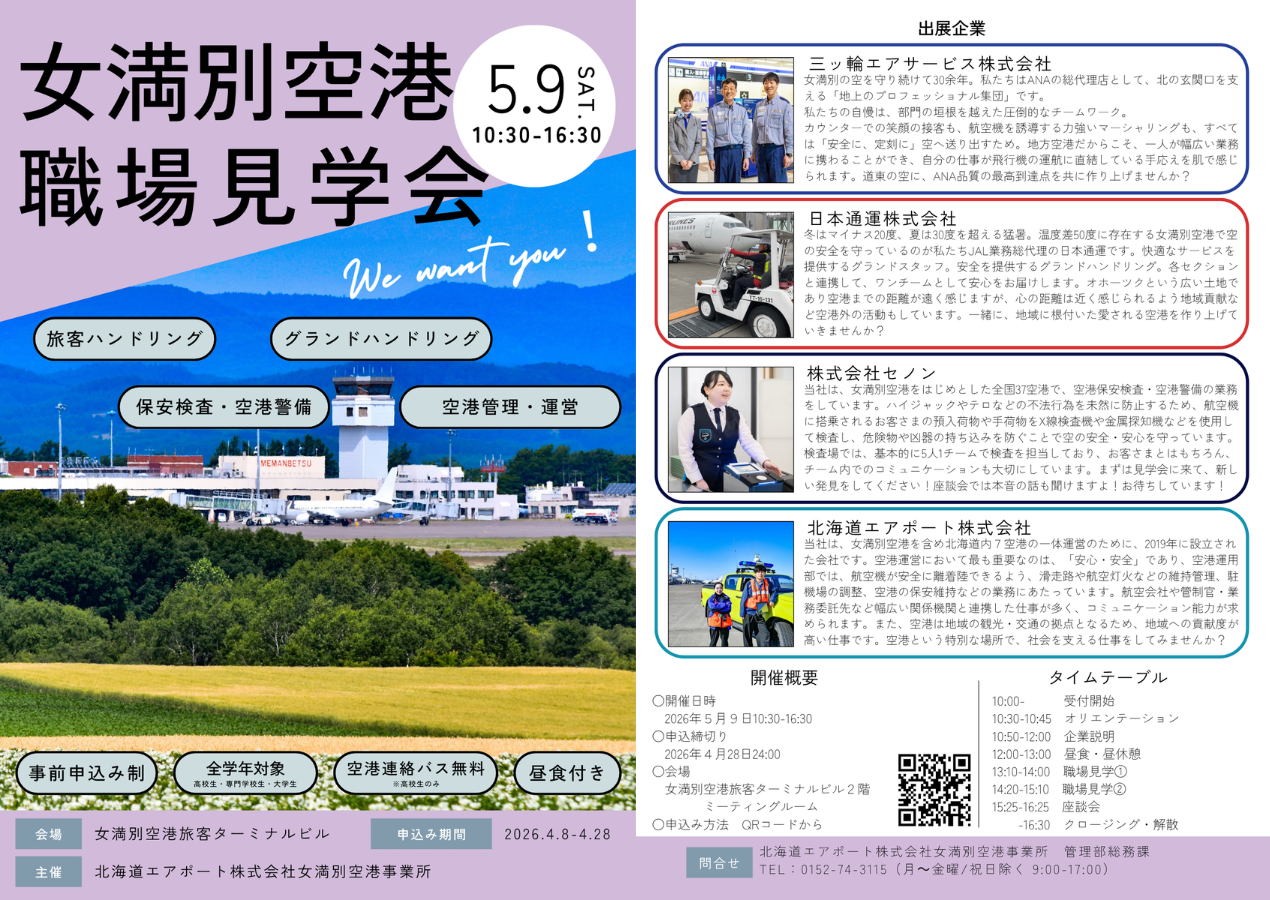 我们将于2026年5月9日举办“女满别机场工作场所参观活动”。本次活动将分为两部分:上午进行公司介绍会,下午进行工作场所参观。欢迎任何高中生、职业学校学生或大学生参加。我们欢迎任何对在机场工作感兴趣的人,以及那些热爱飞机和旅行的人!